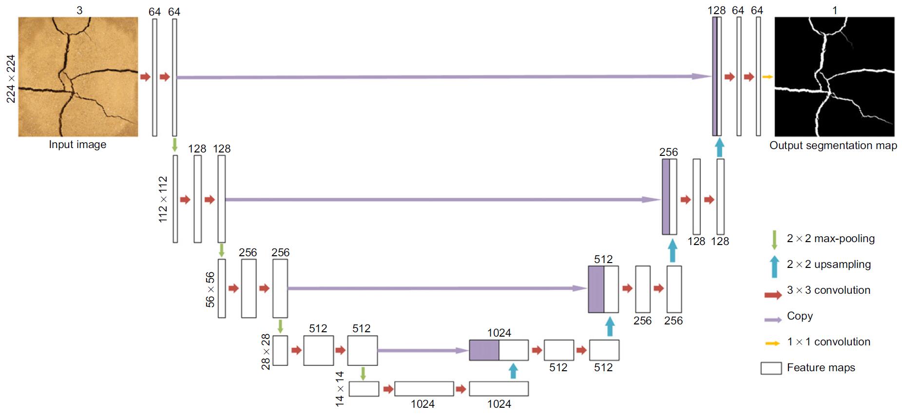 - A new automatic soil cracks recognition method based on a U-Net convolutional neural network (CNN) architecture for segmentation on soil desiccation crack images.